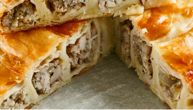 Sipajte mlaku vodu i dodajte suvi kvasac, promešajte. Dodajte brašno i so, pa mešajte dok se sve ne sjedini. Oblikujte testo u valjak i podelite ga na 10 delova. Svaki deo malo razvucete rukom, prebacite ka unutra i pritisnite prstima, oblikujući valjak. Pritisnite pripremljene valjke i uvaljajte ih u posudu sa uljem. Dobro ih potopite, prekrijte kesom da se ne suše i ostavite da odstoje. Mleveno meso pomešajte sa sitno seckanim crnim lukom, solju, bibierom, seckanim peršunom i kiselom vodom. Sve dobro izmešajte i ostavite u frižideru do upotrebe. Nauljite radnu površinu uljem u kojem je stajalo testo. Uzmite jedan deo testa, pritisnite ga rukom i razvucite dlanovima levo i desno, a onda i krajeve rastanjite. Razvučeno testo filujte filom od mesa, koji stavite duž cele trake testa. Prebacite deo testa od sebe preko fila i uvijajte do kraja. Potom formiranu traku uvijte u spiralu i stavite u pleh. I tako redom. Pecite u prethodno zagrejanoj rerni na 220 stepeni dok pita ne porumeni.